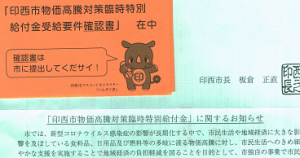 ポストの中に、見慣れないだいだい色の封筒が入っていた。差出人を見ると印西市である。「物価高騰対策給付金」と書いてある。