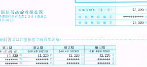 介護保険料は、国保保険料より2日遅れで来た。国保は「国保年金課」、介護保険は「高齢者福祉課」で、同じ市役所でも担当が違う。印刷の色も国保が茶色に対し介護保険は青である。