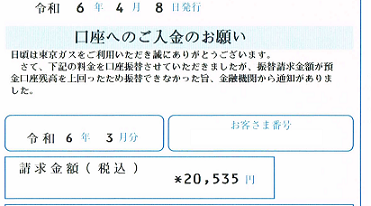 以前は引き落とし不能の場合の2回目は10日頃だったが、近頃は15日の年金支給日後にするのが通例である。東京ガスも、多少は世間というものが分かっているらしい。